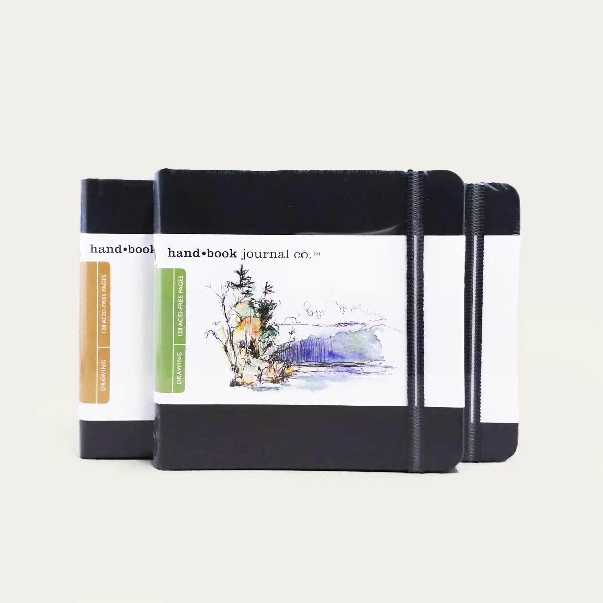 A handsome sketchbook for travel or everyday life, the Travelogue drawing journal is a hand bound, linen-covered artist’s journal with an elastic closure to keep it secure and a ribbon bookmark to hold your place. The warm ivory-colored paper is acid-free and great for pen, pencil, and marker, and will accept light watercolor washes as well. A clear plastic pocket inside the back cover is handy for storing loose papers.