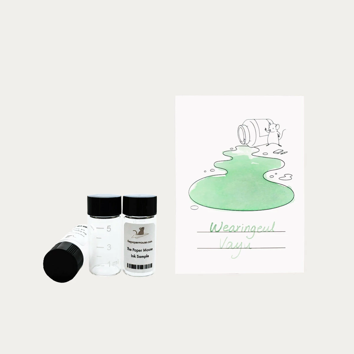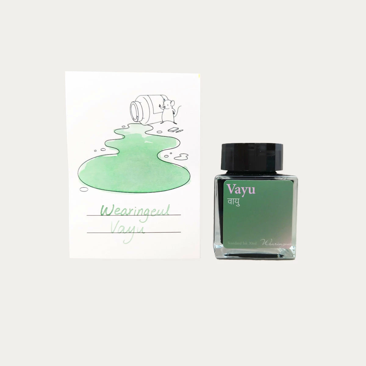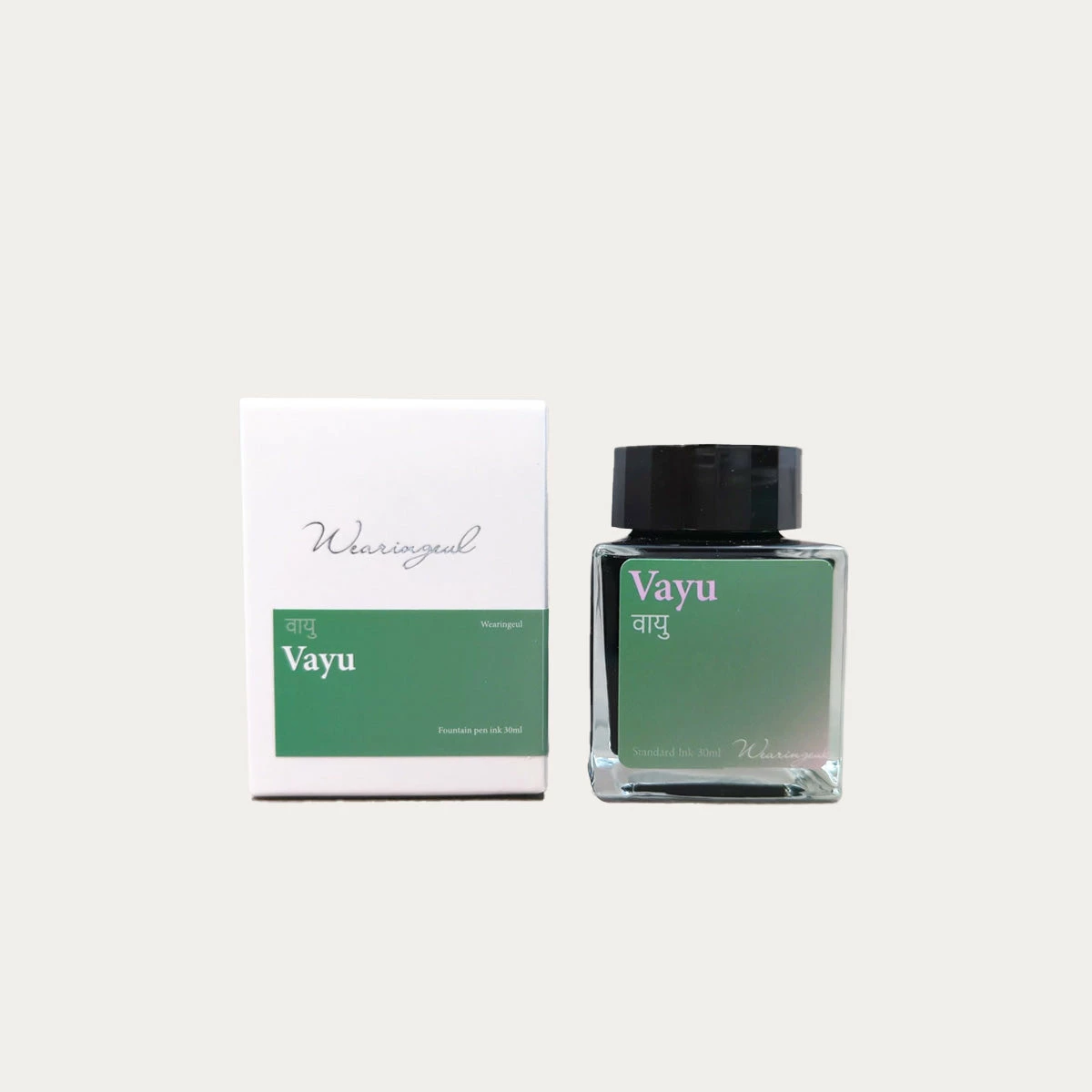 Their Vayu ink is named for the Hindu god of wind and air. They describe it as the color of the feeling of wind: a soft, fresh emerald green with shades of gentle pink blushing through.
