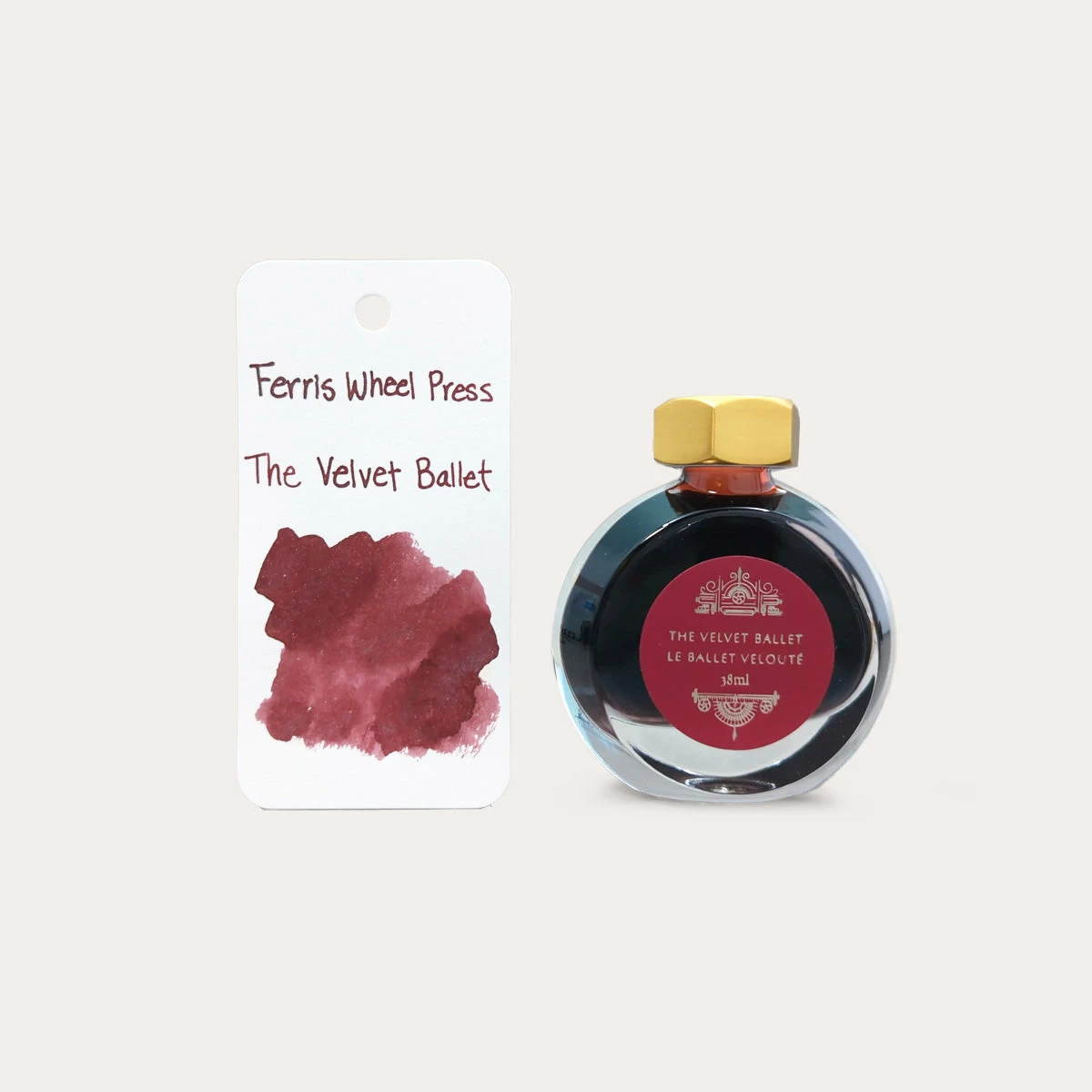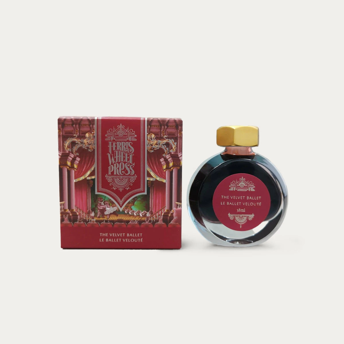 Like all their products, Ferris Wheel Press’s bottled inks are objects of beauty as well as functional tools. Their inks come in round glass bottles with hexagonal brass caps, in a range of rich, gemlike colors. Velvet Ballet is a rich red color with a silvery metallic shimmer.