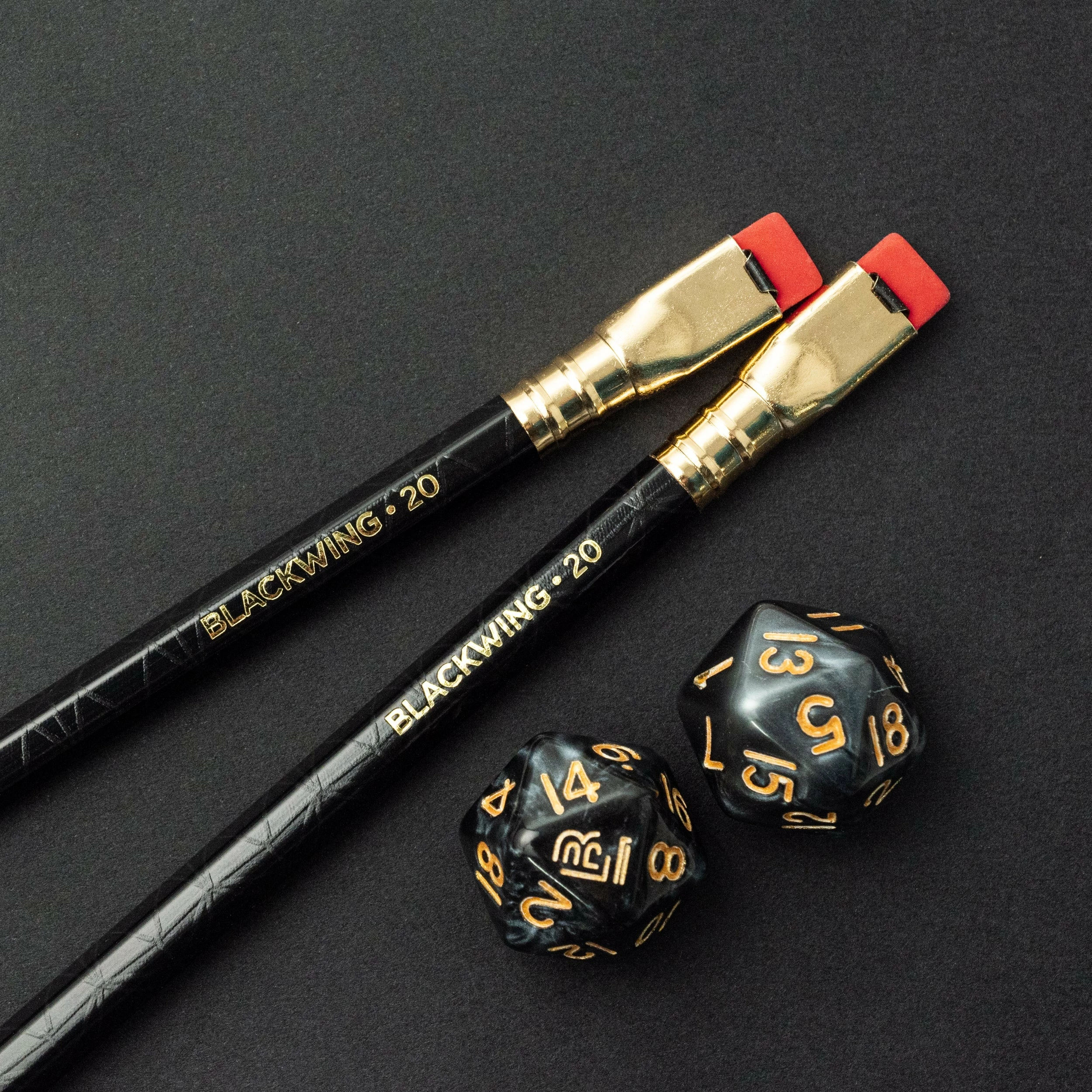 The Blackwing 20 pencil celebrates tabletop games, from games of strategy like chess, mancala, and senet to storytelling games like Dungeons & Dragons. The pencil is named for the twenty-sided dice used in D&D and its design is inspired by gaming dice. It has a glossy black finish with a raised polyhedron pattern and red eraser.