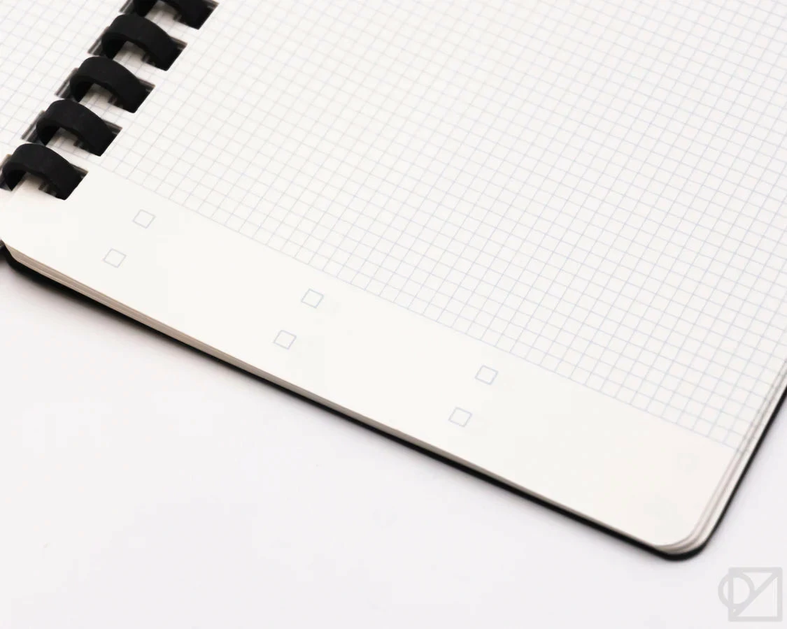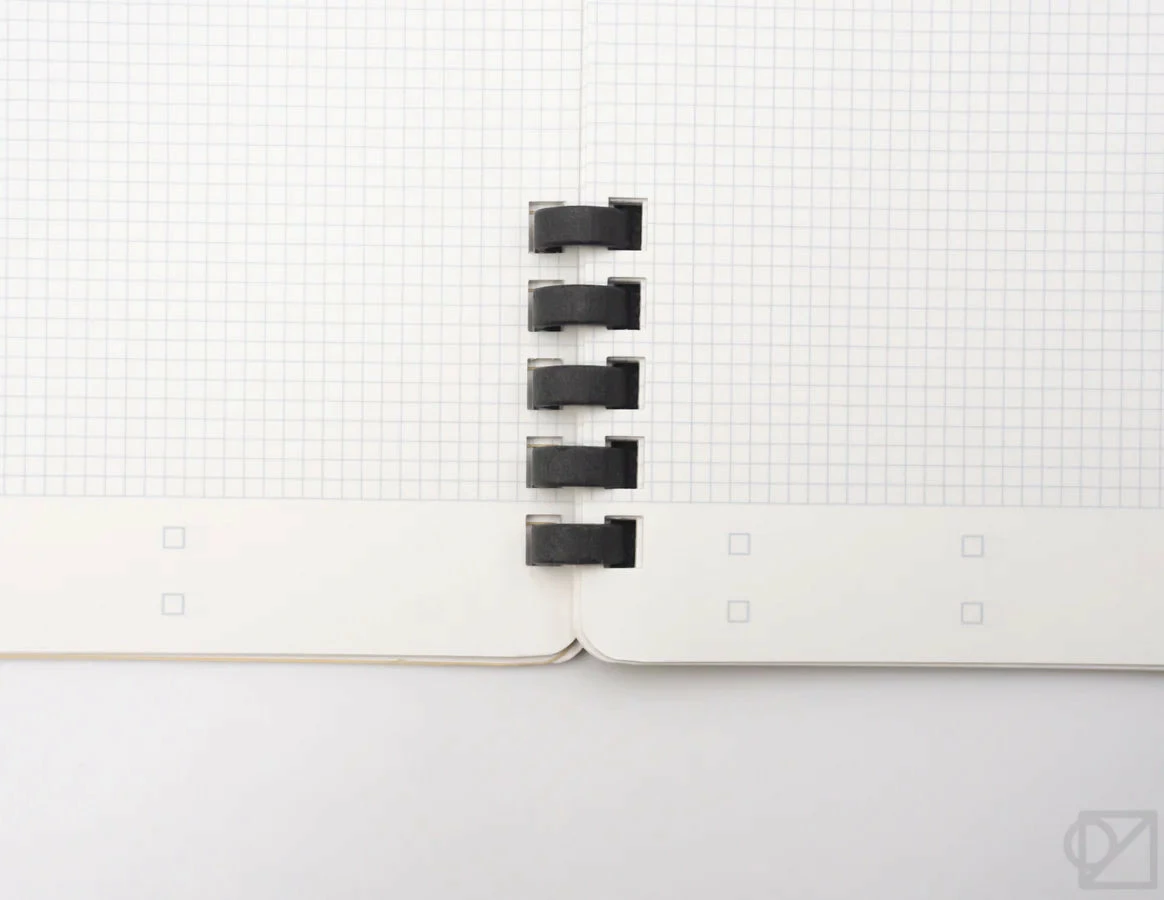 This slim notebook has a versatile page layout that can be used for note-taking, checklists, sketches, and much more. Each page has a line at the top for a date or title, checkboxes at the bottom for tasks, and a fine grid pattern that helps you write neatly or divide up the page. Pages are perforated, which makes them great for writing notes or to-do lists. When you’re done using it, the notebook is fully recyclable, from the pages and covers right down to the paper rings.